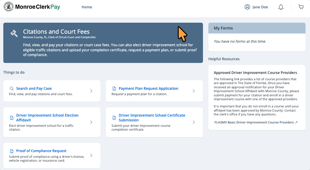 1. Log in to MonroeClerkPay and select Driver Improvement School Certificate Submission